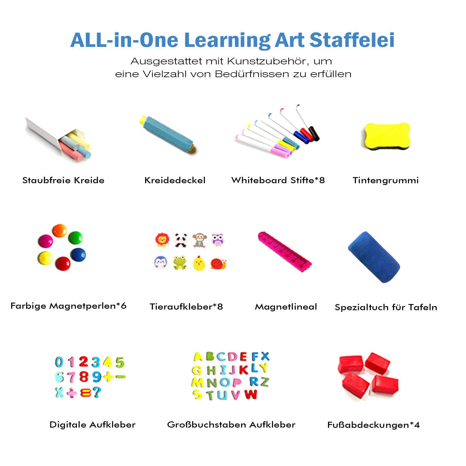 - 【Multifunktionales Schreibtafel】Es gibt eine multifunktionale Schreibtafel mit einer vierfarbigen Tasse und einer Bildlaufwerkzeug in einer Multifunktions-Schüssel, in der Kinder ihre Malutensilien aufbewahren können. Darüber hinaus enthält unser Produkt viele Geschenke wie Whiteboard-Stifte, Kreide, Zahlenaufkleber, Buchstaben-Aufkleber, Tier-Aufkleber, Magnetbänder usw. Diese kleinen Werkzeuge können die Lernzeit der Kinder bereichern und das Schreiben und Mathematikübungen fördern.